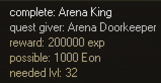 Go back to the Arena Doorkeeper after playing 100 matches to obtain your reward of 200,000 exp and 1,000 eon. After completing this quest, it turns into a weekly quest that you can complete 1x a week for 40,000 exp and 500 eons.