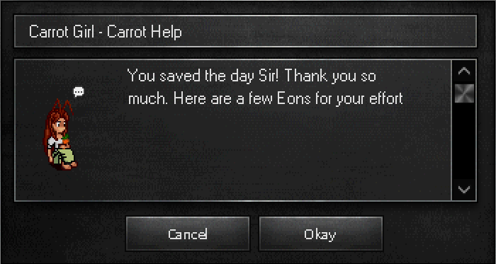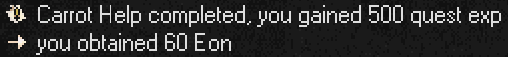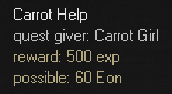 Return to Carrot Girl and give her the 3 normal Carrots. She will thank you and reward you with 500 exp and 60 eons.