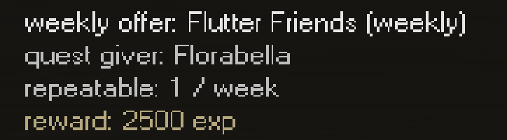 A new buddy can be found at Blobsie Gardens, this weekly quest refreshes every Monday at server reset (3 AM EST). Speak to the Florabella NPC, and click on the workbench behind her to craft the required items. Florabella will request 24 bouquets of one random type: Aeven, Starflower, Skyflower, or Ice Flower.