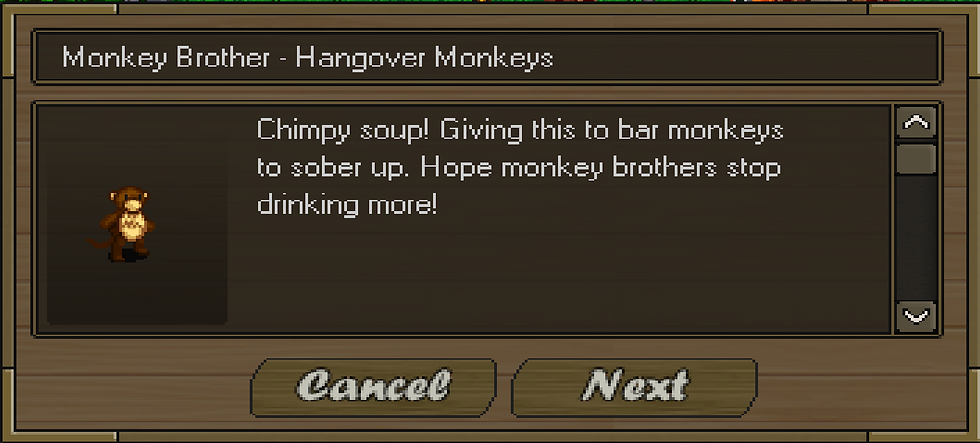 1.Go through the Jungle Maze and arrive at Monkey Island. Monkey Brother asks you to help Monkey Mom make chimpy soup for the sick monkeys. Make sure to bring 10 puffy weed, 8 wild roots, and 4 sun leaves with you.