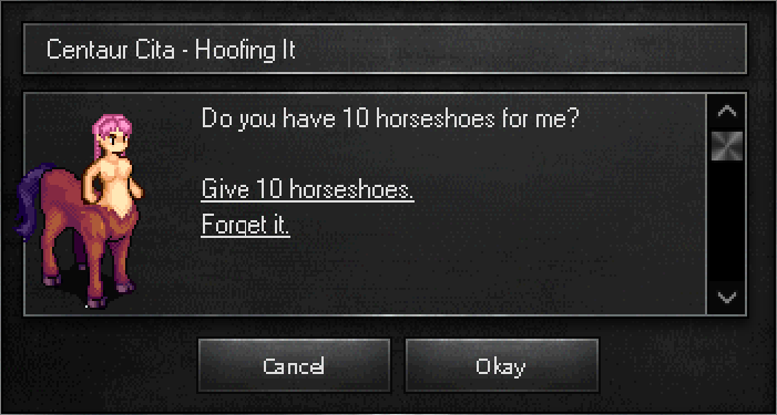 Speak to Centaur Cita. She asks you to gather 10 Horseshoes.