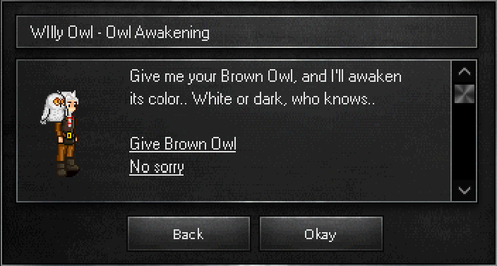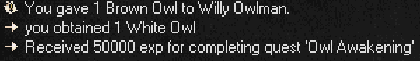 Speak to Willy Owl and give him your Brown Owl. He will reward you with 50,000 EXP and a 50/50 chance to receive either a White Owl or a Dark Owl pet.