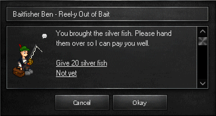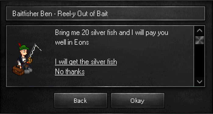Speak to Baitfisher Ben on the docks to start the quest. He will ask you for 20 silver fish.