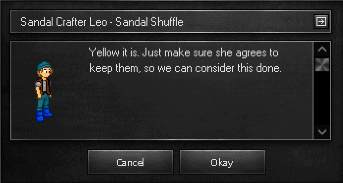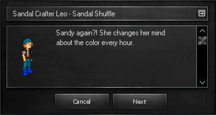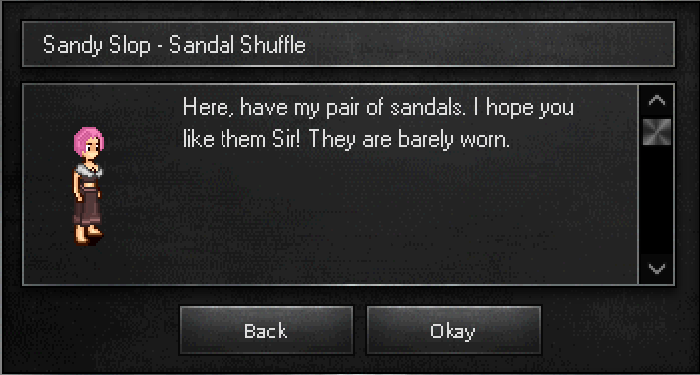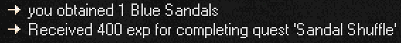 After giving Sandy the new sandals, she thanks you and rewards you with 400 EXP and a randomly colored pair of sandals.